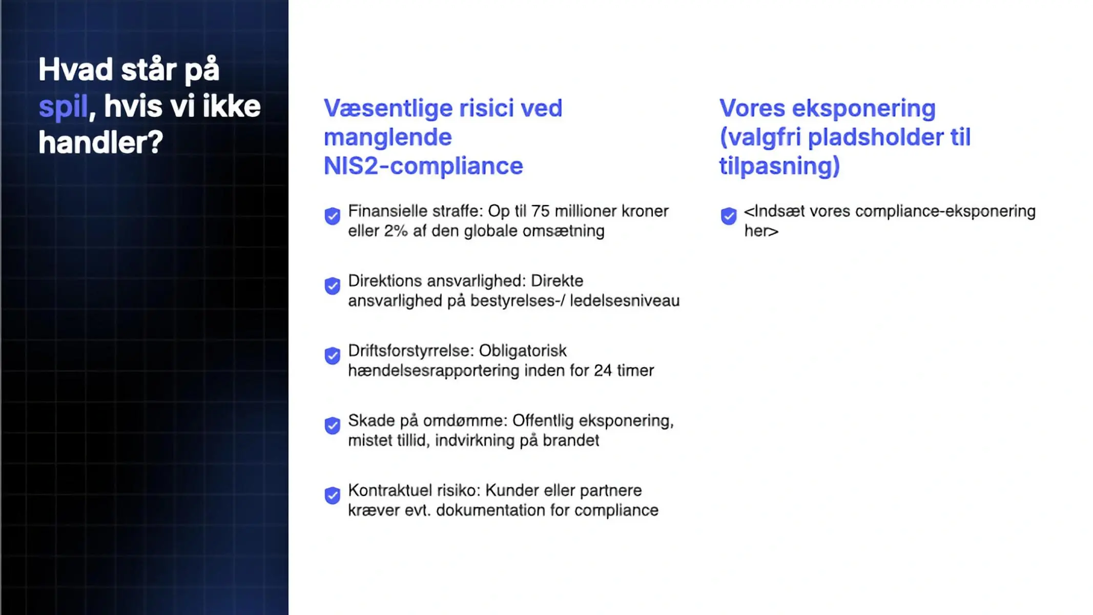 Handlingsplan – trin der skitserer specifikke og målbare initiativer, som hjælper dig med at blive klar til NIS2-fristen