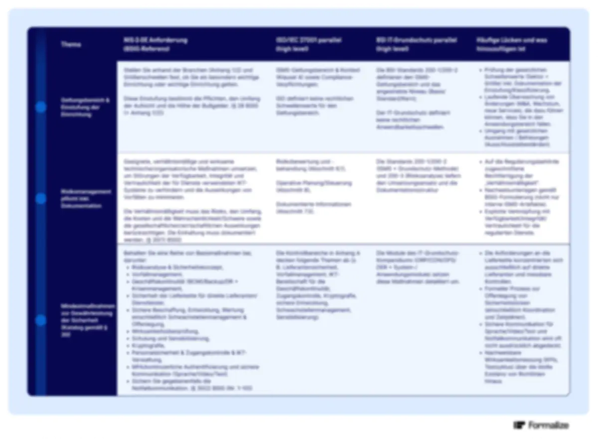 Diese Vergleichstabelle dient ausschließlich allgemeinen Informationszwecken und als praktische Orientierung. Sie stellt keine Rechts‑, Audit‑ oder Zertifizierungsberatung dar und ersetzt keine Einzelfallprüfung. Die dargestellte Zuordnung zwischen Anforderungen aus NIS‑2 bzw. dem nationalen Umsetzungsgesetz und ISO/IEC 27001 sowie BSI IT‑Grundschutz erfolgt bewusst auf High‑Level, ist weder vollständig noch als 1:1‑Mapping zu verstehen. Ob und wie Pflichten gelten, hängt u. a. von Einstufung, Branche, Größe, Risikolage sowie behördlicher Auslegung ab. Für verbindliche Bewertungen nutzen Sie bitte die Originalquellen und konsultieren Sie Ihre Rechts‑/Compliance‑Abteilung oder qualifizierte Beratung.