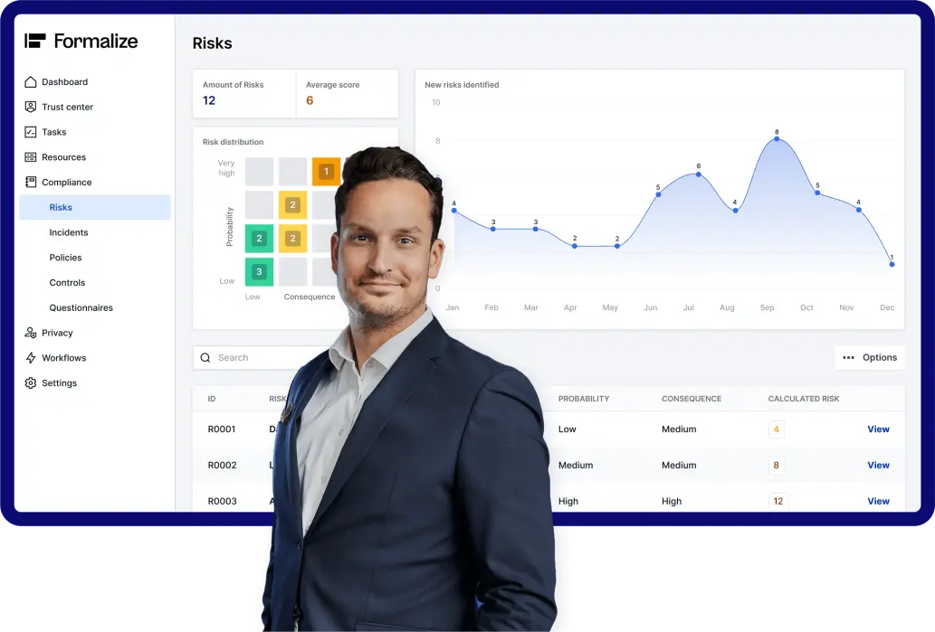 Formalize is designed to simplify your compliance processes and effectively manage various regulations and frameworks, including NIS 2, DORA and ISO 27001. With integrated risk management and incident management features, our software ensures seamless compliance. Enhance your ISMS (Information Security Management System) with comprehensive tools tailored for both the seasoned CISO and new compliance officers. Formalize provides efficient, user-friendly compliance management, keeping your organization ahead in regulatory standards. Explore how you can speed up NIS 2. Book a demo today.