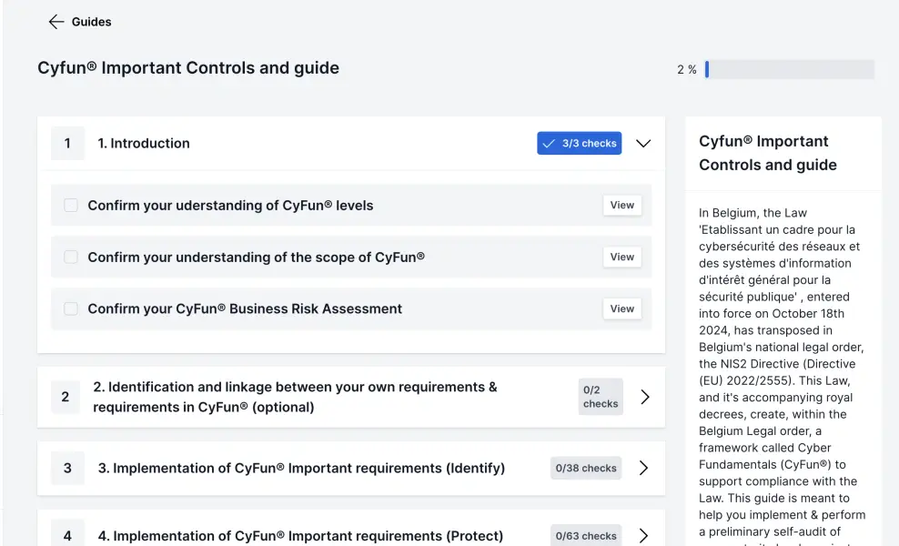 CyFun® puede considerarse una guía práctica para ayudar a las empresas a cumplir con la legislación belga y, por lo tanto, la directiva NIS2 original que esta ley transpone.