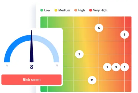 Obtenga una visión general de las puntuaciones de riesgo inherente y residual según los requisitos de DORA. También puede hacer un seguimiento de sus esfuerzos de mitigación de riesgos y documentar el proceso para las partes interesadas, con la opción de definir en diferentes tipos de riesgo y procedimientos para trabajar con los riesgos.